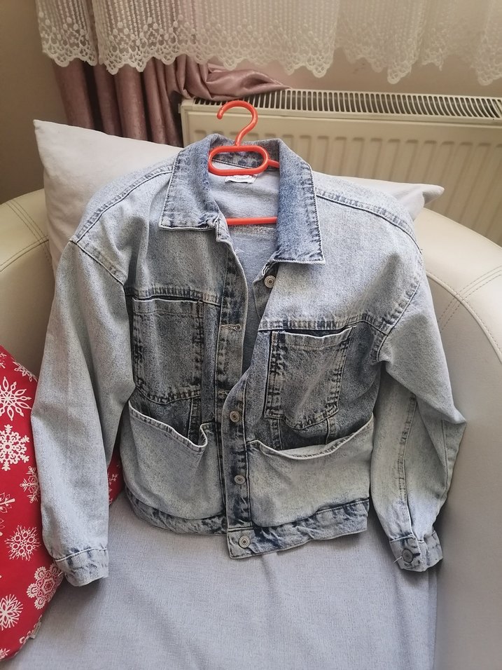 Gri renkli, düğmeli, uzun kollu ve notched lapel yakalı kadın denim ceket. Salaş kesimi ve midi boyuyla günlük sokak stiline uygun, tie-dye desenli.