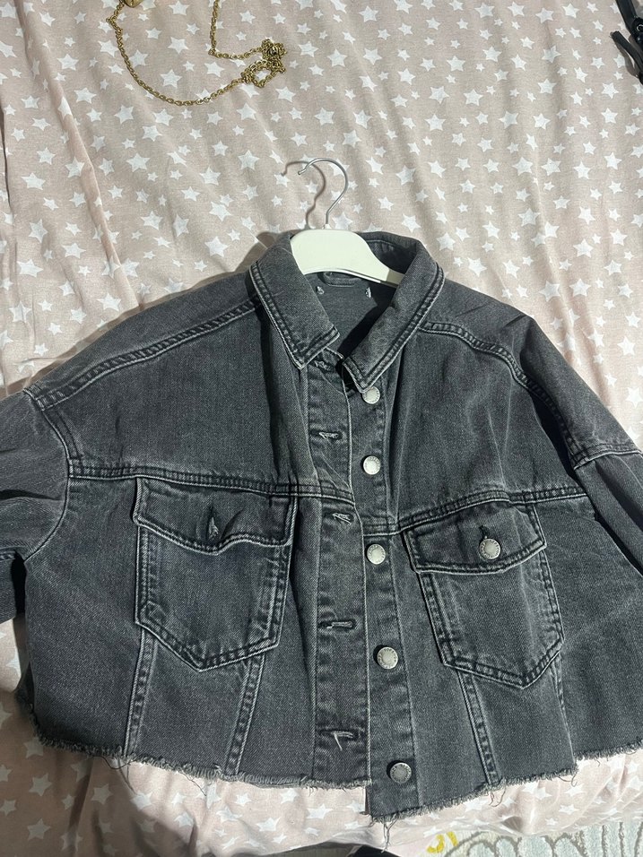 Gri renkli, düğmeli, bol kesim kadın denim ceket. Uzun kollu ve çıtçıtlı, günlük ve sokak stiline uygun normal boyda bir model.
