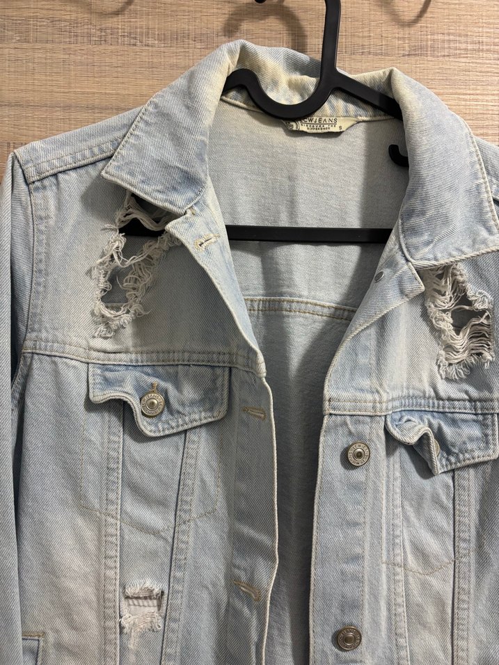 Gri renkli, düğmeli ve işlemeli detaylara sahip kadın denim ceket. Salaş kesim, yaka detayı ve askılı kollu tasarımıyla günlük rahat sokak stili sunar.