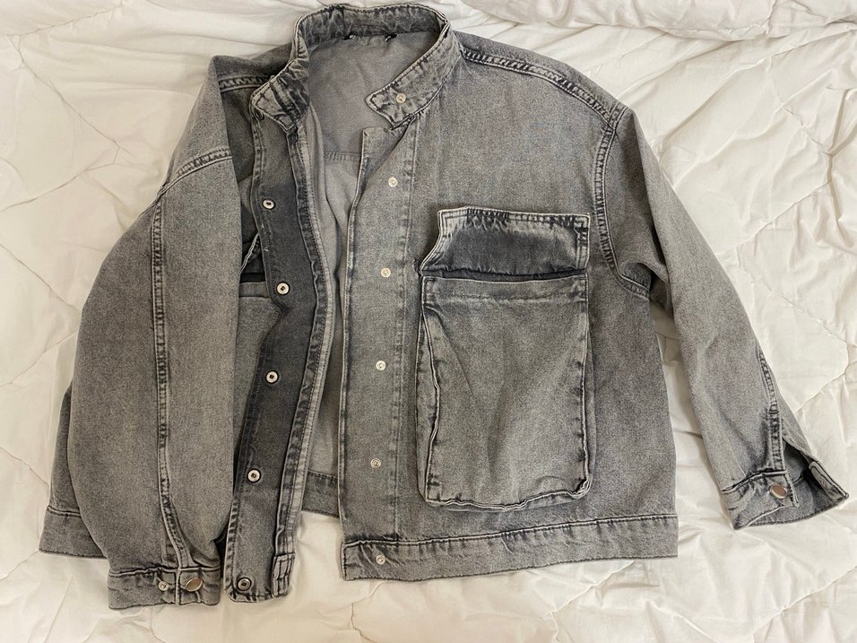 Gri denim kumaştan, düğmeli ve cep detaylı, bol kesim uzun kollu kadın ceket. Sokak stiline uygun, rahat bir tasarım. marka temsili