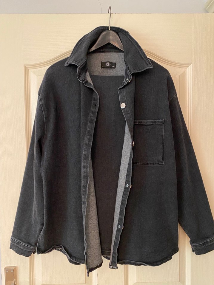 Gri renkte, düğmeli, uzun kollu, notched lapel yakalı, bol kesim kadın denim ceket. Rahat ve günlük sokak stili için ideal. Likralı. Beli lastikli palazzo pantolon takımı