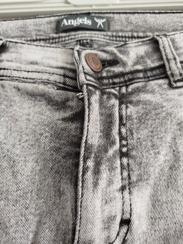 Angels markalı, düğmeli gri denim kadın jean. Sokak stiline uygun, günlük kullanıma elverişli, midi boy ve desensiz.