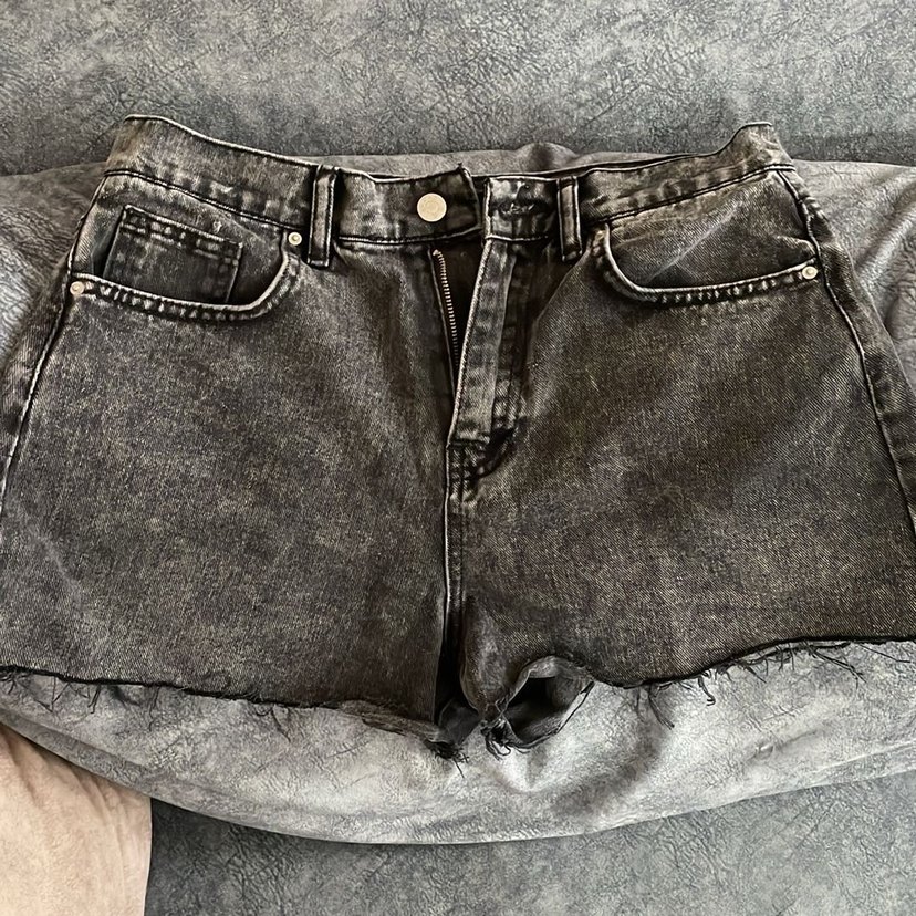 Gri renkli, düğmeli ve normal boyda kadın denim şort. Sokak tarzına uygun, günlük kullanıma elverişli ve rahat bir görünüme sahiptir.