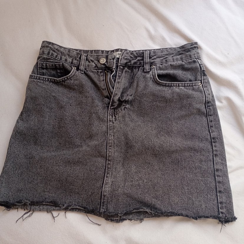 Gri renkli, düğmeli ve bol kesim denim mini etek. Normal uzunlukta, desen içermeyen ve günlük sokak tarzına uygun bir model.