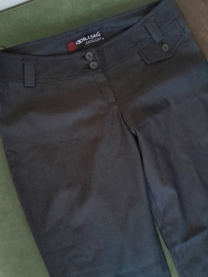 Gri düğmeli kadın denim pantolon, normal midi boyda ve regular fit kesime sahiptir. Desensiz tasarımıyla ofis kullanımı için uygundur.