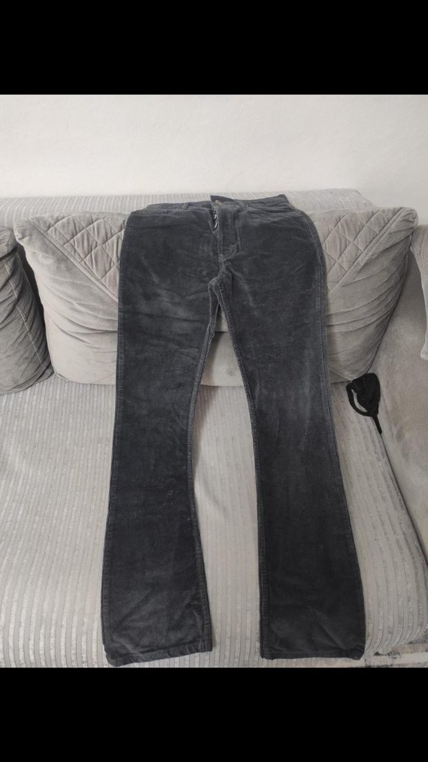 Gri düğmeli, normal kesim ve midi boy denim pantolon, gündelik kullanıma uygundur. Desensiz, sade tasarıma sahiptir.