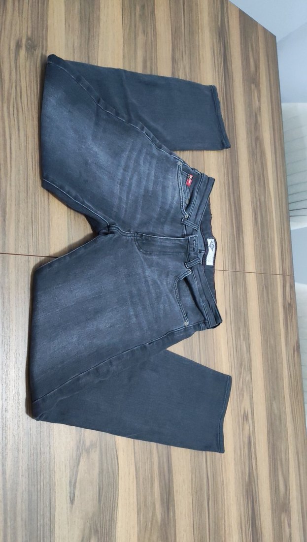 Gri düğmeli denim pantolon, rahatlık için pamuk ve elastan karışımıdır. Sıfır hiç gıyılmedı. Erkek pantolonu