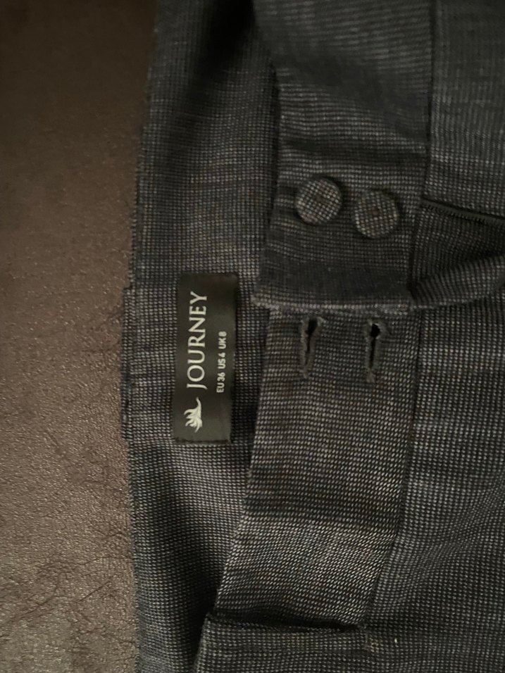 Gri düğmeli denim kumaştan, ofis ortamına uygun, normal boy ve fitted kesim kadın pantolon. Normcore tarzıyla sade ve şık görünüme sahiptir.