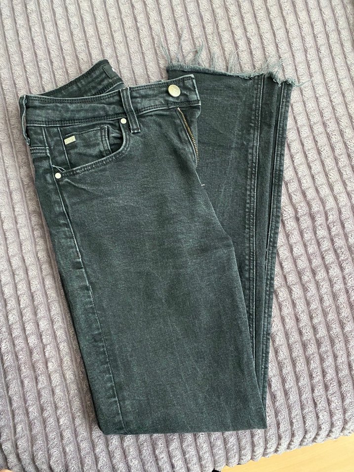 Gri renkli, düğmeli detaylara sahip, normal boy ve regular fit kadın denim pantolon. Günlük kullanıma uygun, rahat ve sade tarzda.