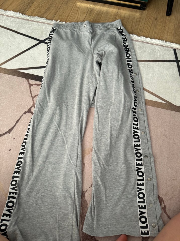 Pamuklu, bol kesim gri eşofman altı, yanlarda 'LOVE' baskılı şeritler ve düğme detaylarıyla günlük rahat kullanım için uygundur.
