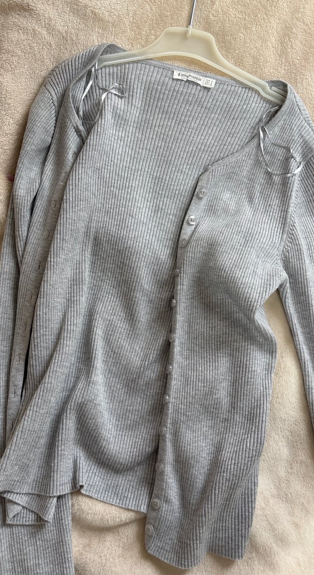 Gri renkli, düğmeli, triko kumaştan yapılmış kadın hırka. Uzun kollu, notched lapel yaka ve midi boyda, rahat kesimlidir. Günlük kullanıma uygundur.