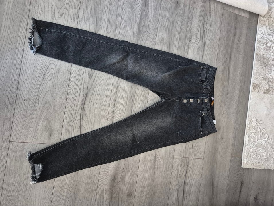 Gri düğmeli, normal kesim kadın jean pantolon, günlük kullanıma uygun rahat stil.