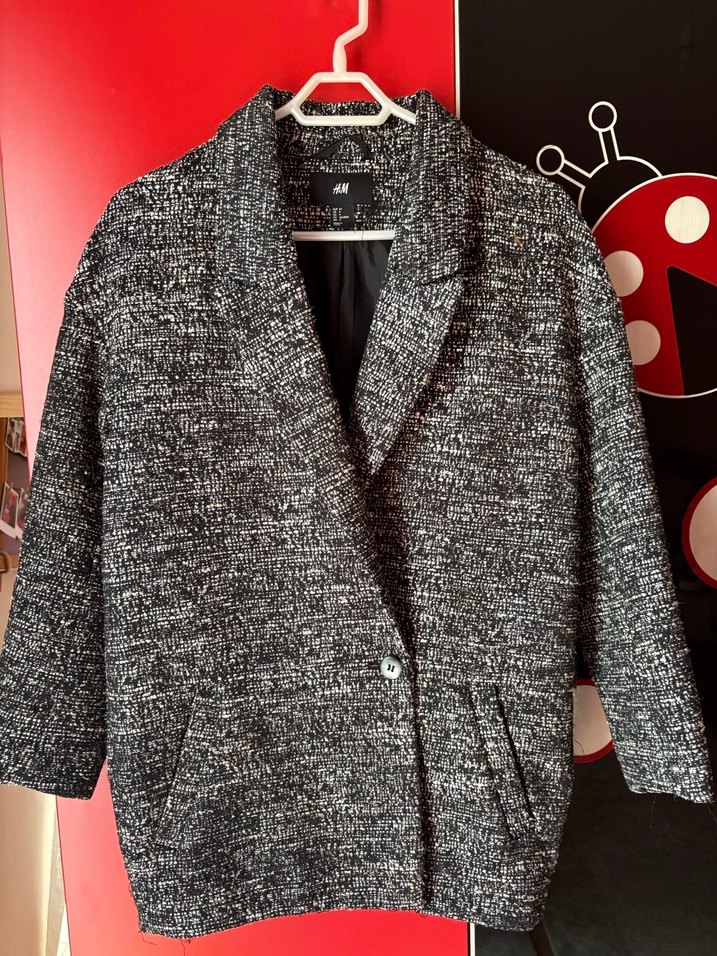 Bu kısa boy gri yün kaban, düğmeli ve kesik yakalıdır. Uzun kollu ve rahat kesim olup günlük sokak stili için uygundur.