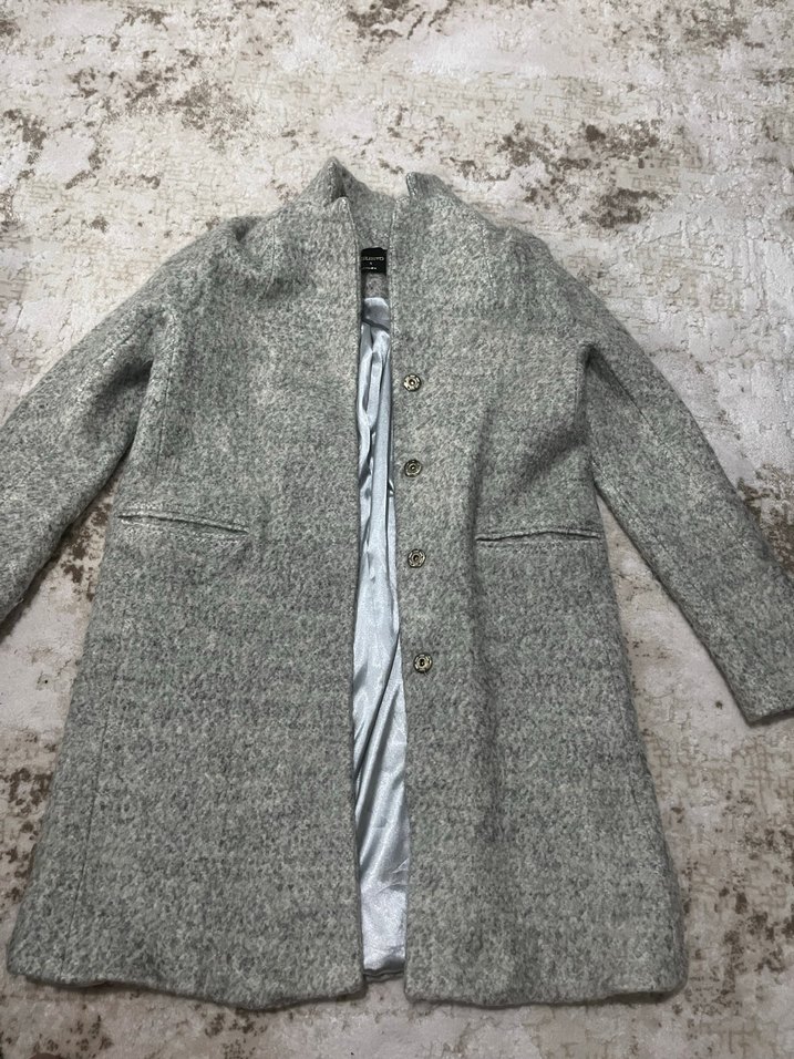 Gri renkli, düğmeli ve iki cepli kadın kabanı. Yumuşak dokulu kumaşa ve rahat iç astara sahiptir.