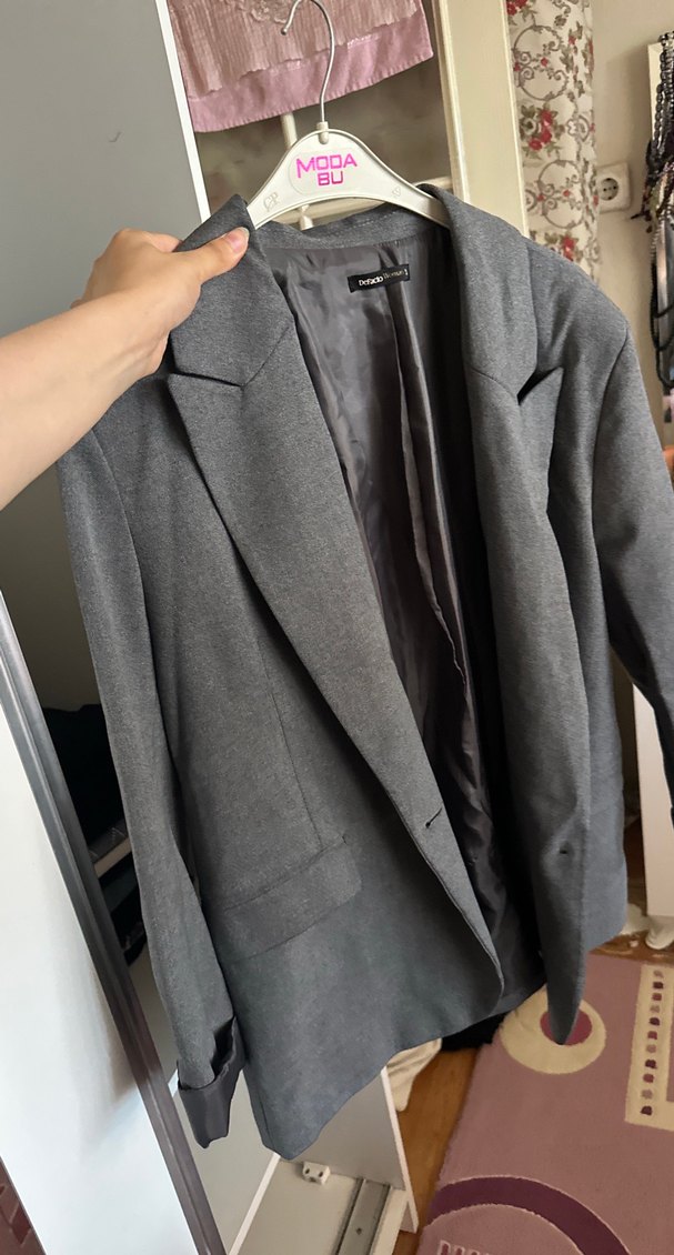 Gri keten kumaştan, düğmeli, normal uzunlukta kadın blazer ceket. Notched lapel yakalı, uzun kollu ve düzenli kesimlidir.