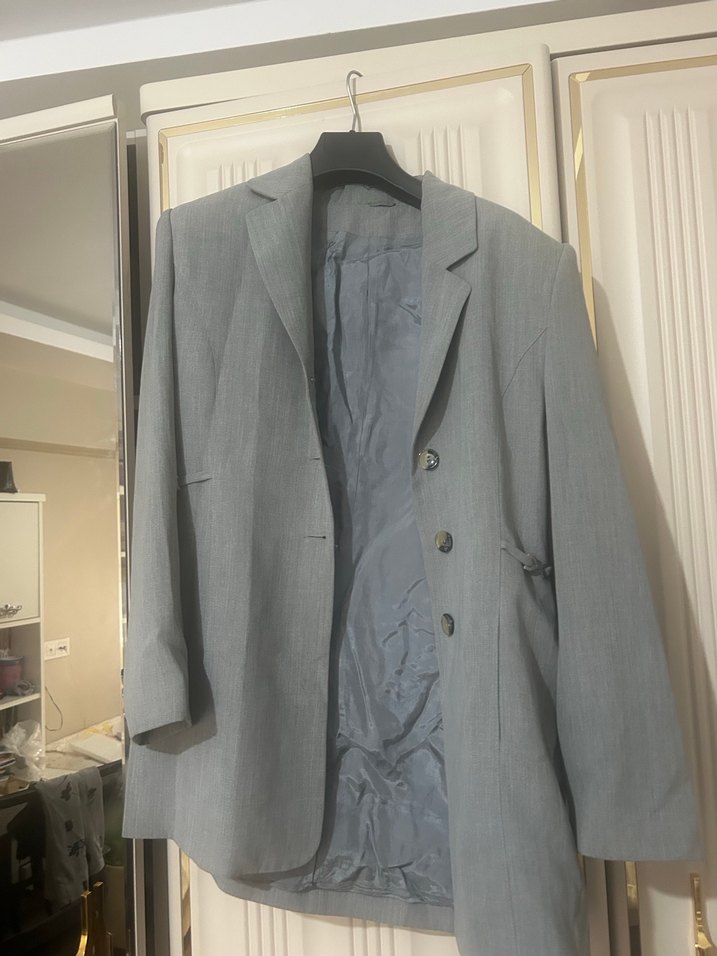 Gri keten kumaştan, düğmeli, klasik kesim ve uzun kollu kadın ceket. Midi boyda ve desensiz, ofis için uygun şık bir parça. ✨