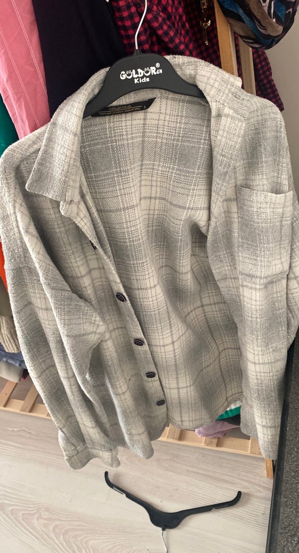 Gri keten kumaştan, düğmeli ve uzun kollu, rahat kesim kadın gömleği. Notched lapel yaka ve midi boy ile günlük kullanıma uygun.