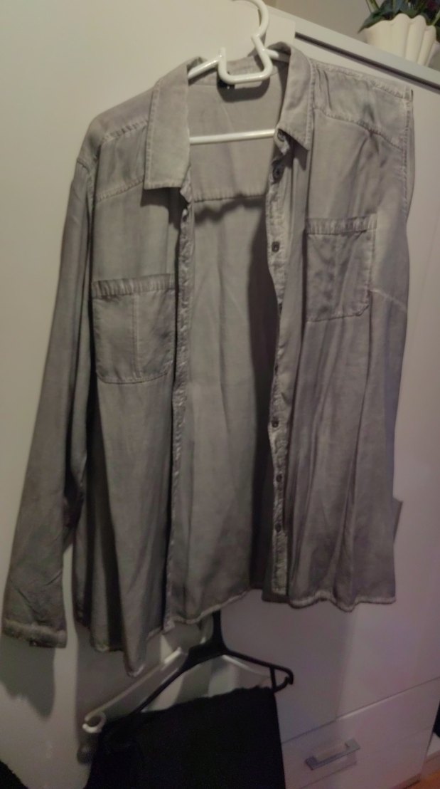 Gri keten kumaştan, uzun kollu ve düğmeli, salaş kesim kadın gömlek. Notlu yakası ve günlük rahat stil sunar.