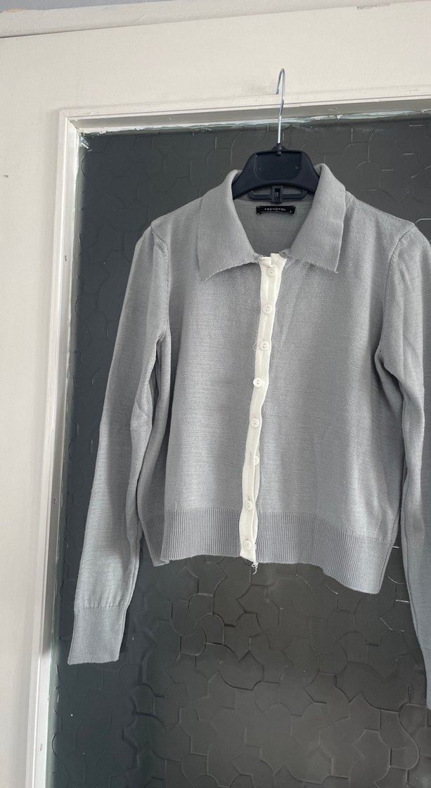 Gri keten hırka, düğmeli ön, uzun kollu ve yakalıdır. Normal kesim ve midi boyda, günlük rahat kullanım için uygundur.