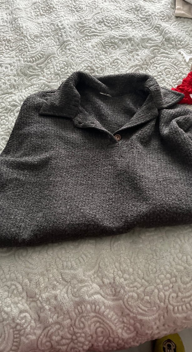 Kadın keten kumaştan, düğmeli ve yakalı gri kazak. Uzun kollu, bol ve normal uzunlukta, rahat ve gündelik stil için uygundur.