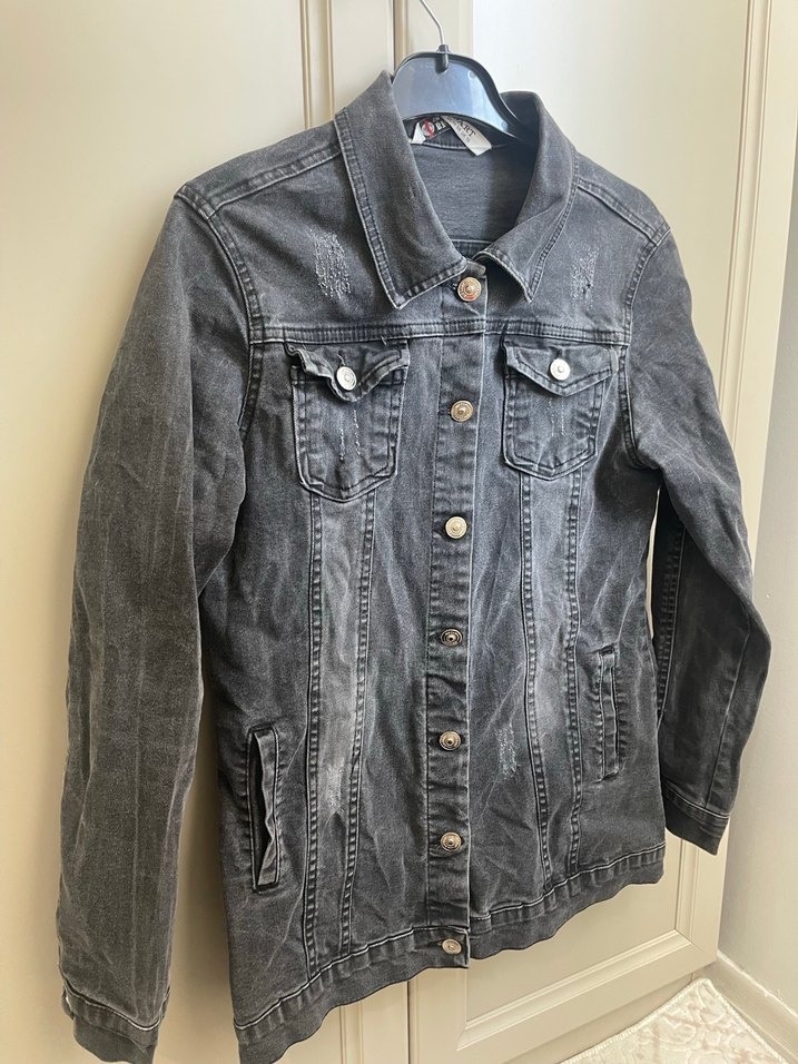 Gri renkli, düğmeli, uzun kollu, normal uzunlukta, bol kesim kadın kot ceketi. Notlu yaka ve günlük kullanıma uygun sokak stili.