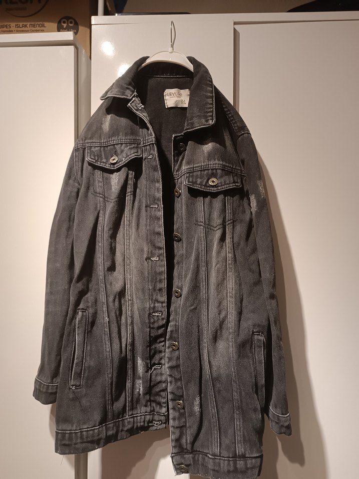 Gri renkli, düğmeli, uzun kollu ve notched lapel yakalı kot ceket. Rahat kesimi ve midi boyuyla günlük sokak stiline uygundur. yırtık görünümlü ve yepyenidir
