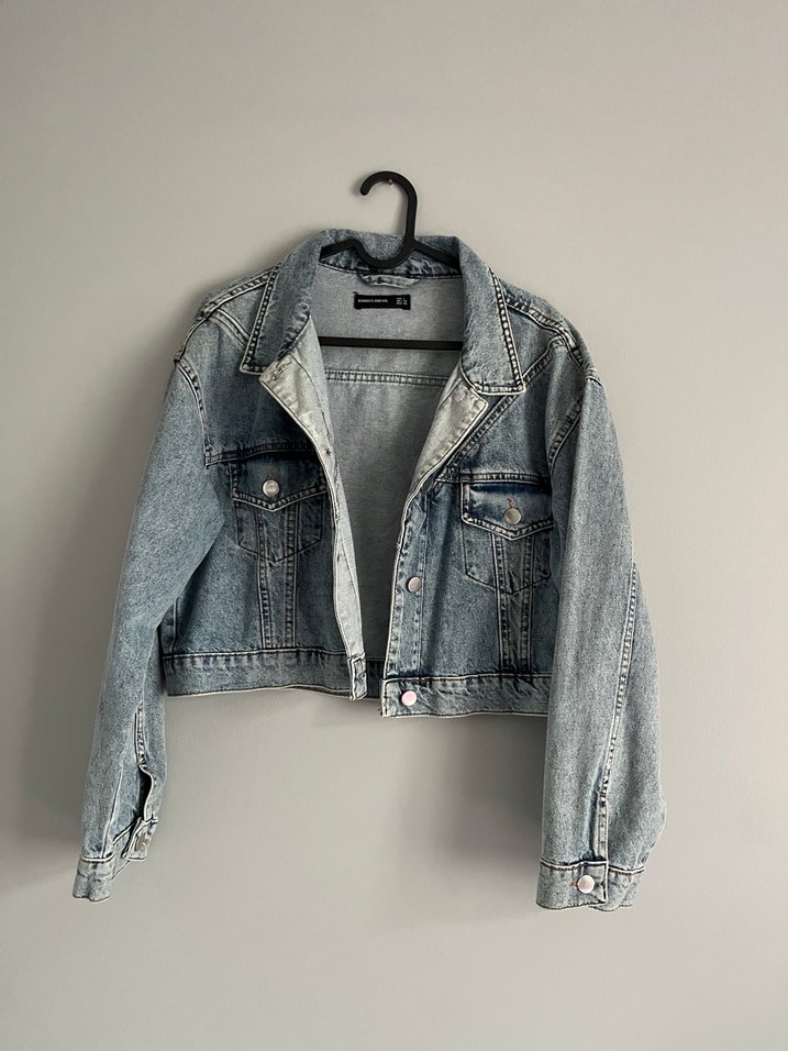 Gri denim kumaştan, düğmeli ve kesimli yakalı kadın ceket. Uzun kollu, normal boy ve bol kesim, günlük sokak stiline uygun.Orijinal barrels and pil marka.