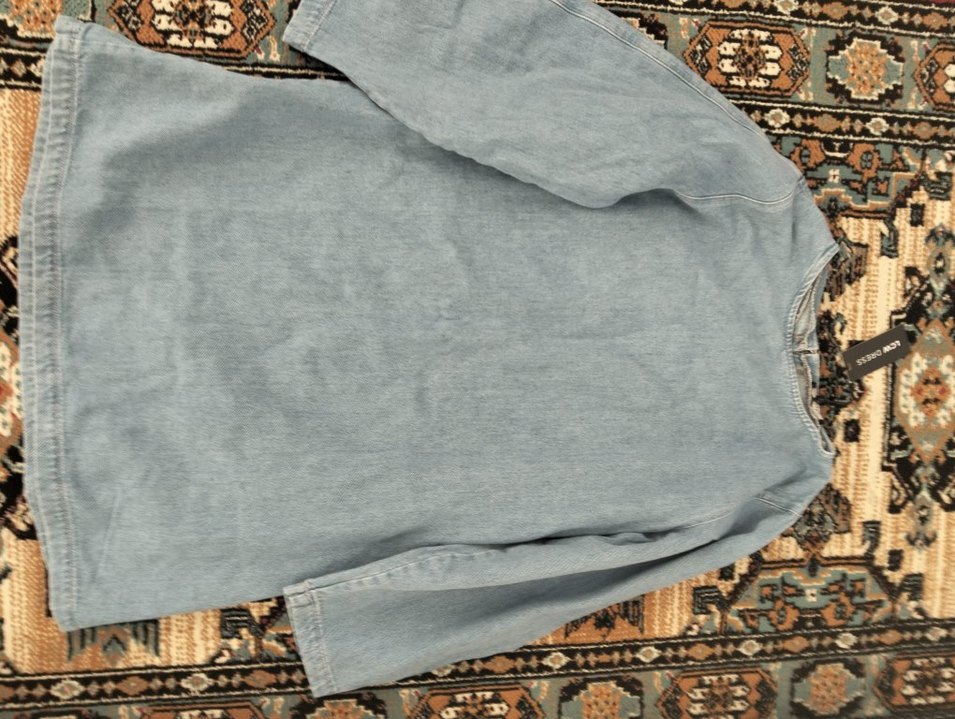 Gri kot kumaştan, düğmeli, uzun kollu, salaş kesim kadın ceket. Bohem tarzda, günlük kullanıma uygun.