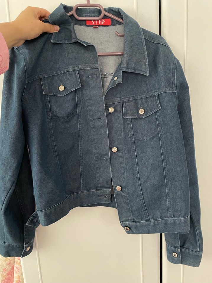 Gri düğmeli kadın kot ceket