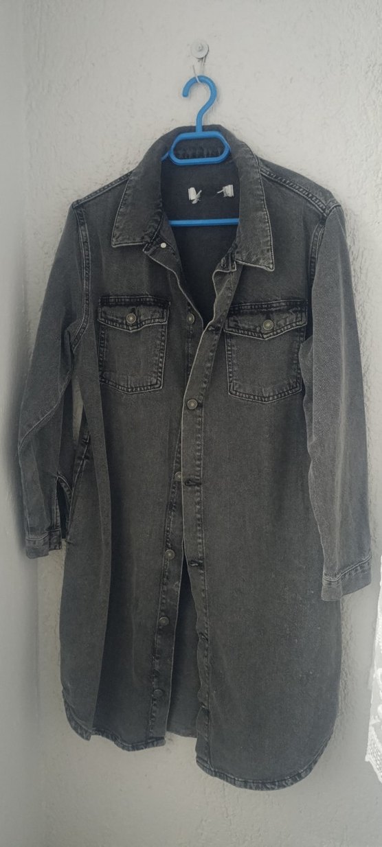 Gri renkte, düğmeli ve cep detaylı uzun kollu bol kesim kadın midi denim ceket. Rahat ve günlük kullanım için uygundur.