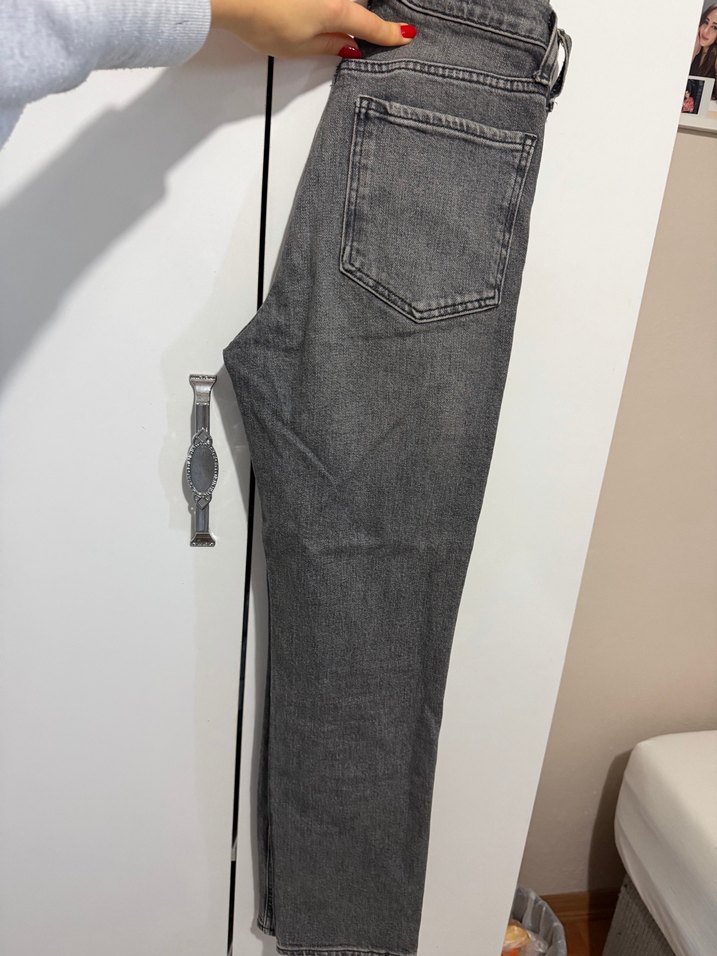 Gri renkte, düğmeli ve batik desenli salaş kesim kadın kot pantolon. Midi boy, günlük kullanıma uygun rahat bir model.