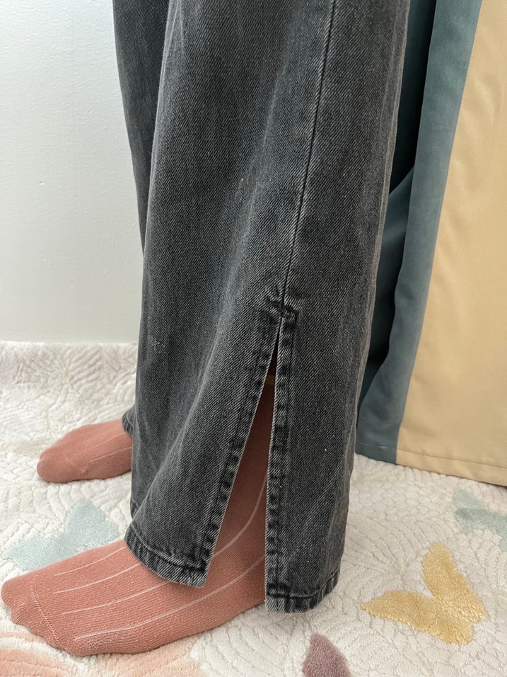 Gri renkte, düğmeli, bol kesim kot pantolon. Normal boyda, yan tarafları paçadan yırtmajlıdır , sadece bel kısmında dikiş delikleri vardır, bu da kullanıma mani değildir, buna bağlı fiyat yazılmıştır