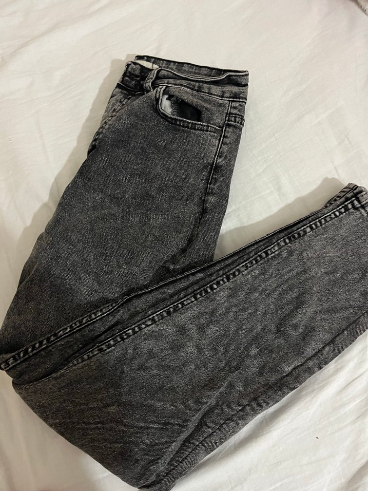 Gri renkli, düğmeli ön kısmı ve midi boyu ile günlük kullanıma uygun, rahat kesimli kadın kot pantolon. S beden uyumludur çok az kullanıldı