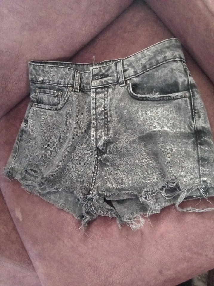 Gri düğmeli ön kısmı ve yıpranmış kenarlarıyla bol kesim kot şort, sokak stili ve günlük kullanım için uygun. mango