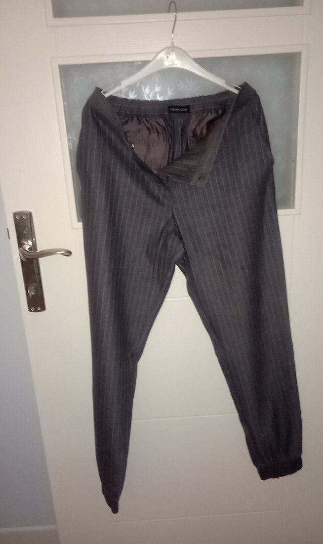 Gri renkli kadın kumaş pantolon, normal boy ve regular fit. Düğmeli detaylı, sentetik kumaştan, ofis ve günlük kullanıma uygun.