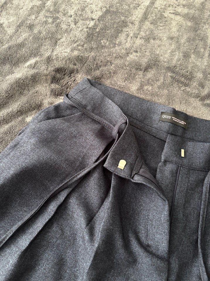 Gri renk, düğmeli, rahat kalıp kadın kumaş pantolon. Yumuşak ve sıcak dokusuyla günlük kullanıma uygun