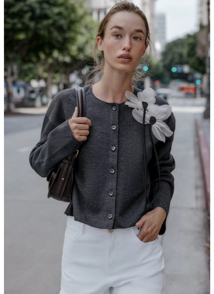Bu gri örme hırka, düğmeli ve uzun kolludur. Salaş kesimi ve yuvarlak yakasıyla günlük kullanıma uygundur. Midi boydadır.