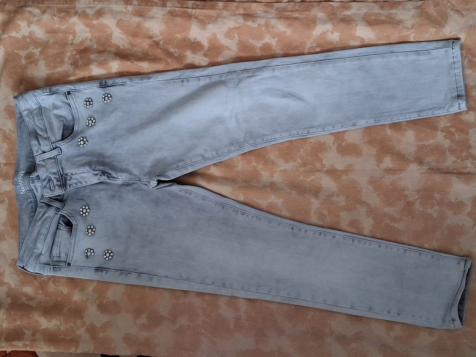 Gri renkli, düğmeli detaylara sahip midi uzunlukta kadın kot pantolon, rahat kesimi ve denim kumaşıyla günlük kullanıma uygundur.