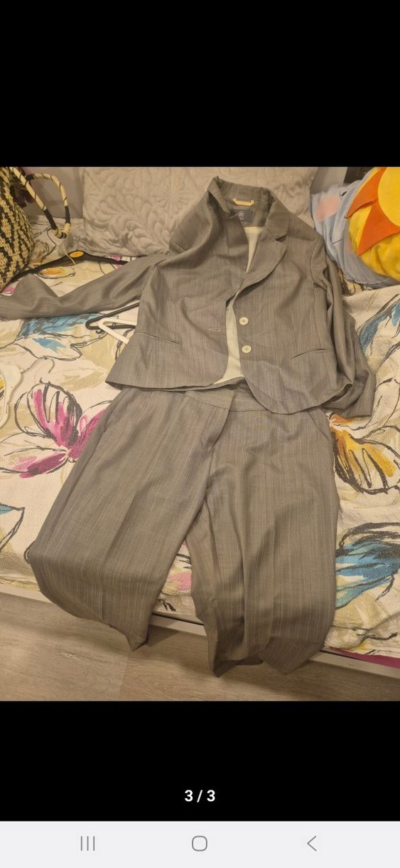 Gri renkte, düğmeli, normal boy midi uzunluğunda, regular fit kadın takımı. Notch yaka ve uzun kollu, iş ortamına uygun sentetik kumaştan. (düşük bel)