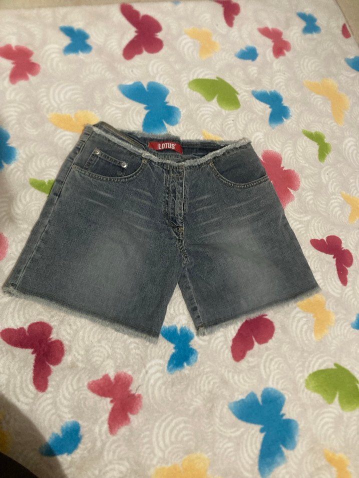 Gri renkli, düğmeli ve bol kesim kadın mini denim şort, hafif batik deseniyle günlük kullanıma uygundur.