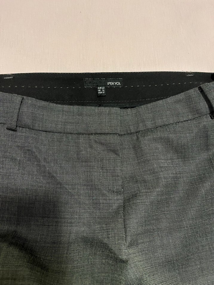 Gri düğmeli, normal kesim ve uzun boy kadın kumaş pantolon. Düz ve desensiz, ofis kullanımı için uygun sentetik kumaştan yapılmıştır. Sadece 1 kez giyildi beden değişikliğinden satısta