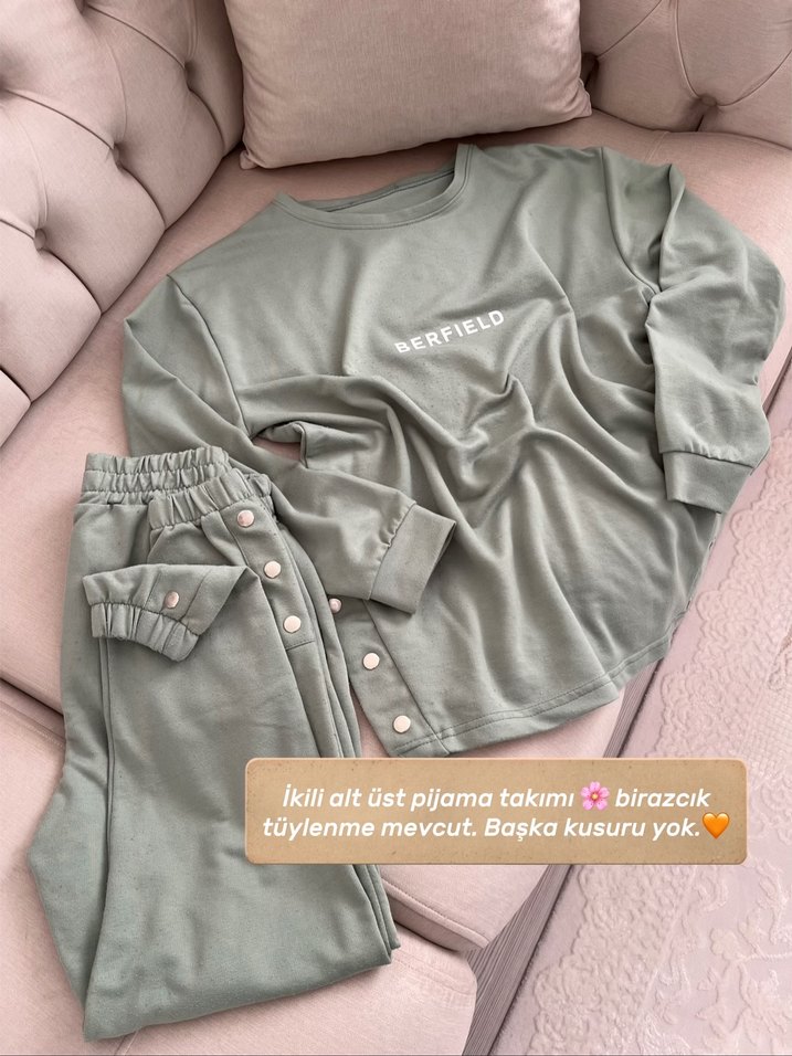 Gri düğmeli, uzun kollu, rahat kesim kadın eşofman takımı. Biraz tüylenme mevcut, başka kusuru yok.