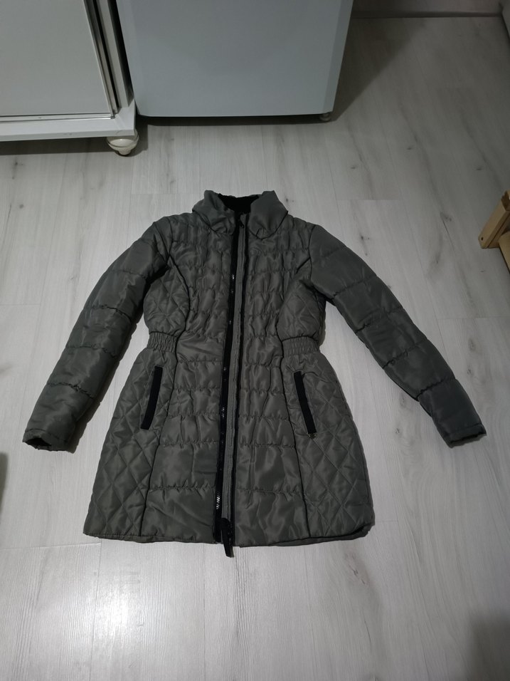 Gri düğmeli, uzun kollu, notalı yaka detaylı kadın ceket. Sentetik kumaştan, midi boyda ve sade tasarımlı, günlük kullanıma uygun rahat bir model.