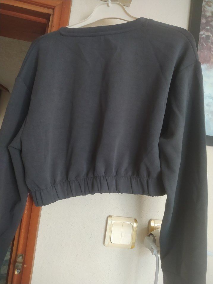 Gri renk, düğmeli, yuvarlak yaka, uzun kollu, bol kesim kadın sweatshirt. Alt kısmı lastikli, rahat ve şık bir model.