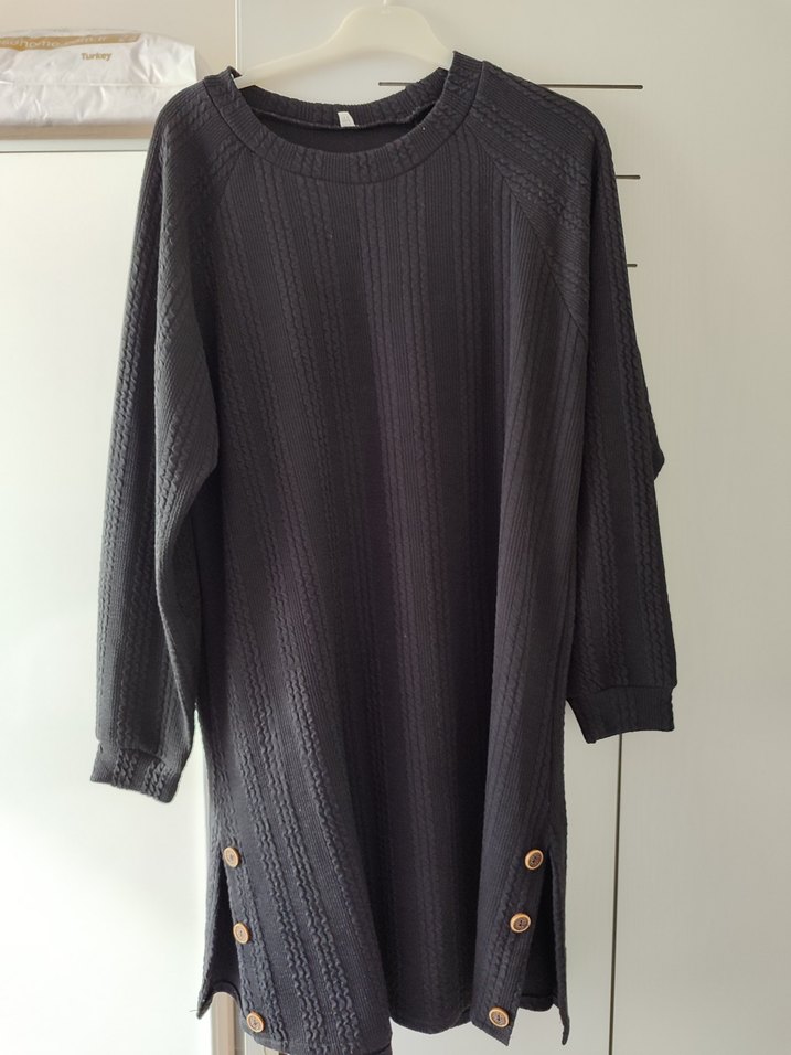 Gri renkte, uzun kollu, yuvarlak yaka, düğme detaylı bol kesim midi triko elbise. Rahat ve günlük kullanıma uygun bir üründür.
