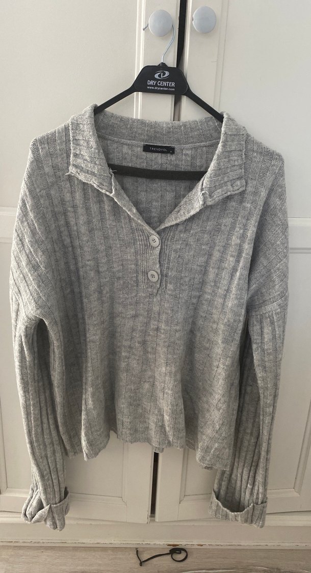 Gri renkli, düğmeli ve yakalı triko kazak, bol kesim ve uzun kollu. Normal boyda, rahat ve gündelik kullanıma uygun bir model.
