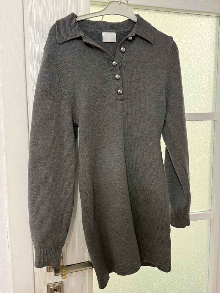Gri renkte, düğmeli ön kısmı ve yakalı tasarımıyla kadın triko mini elbise. Uzun kollu, bol ve rahat kesimlidir.