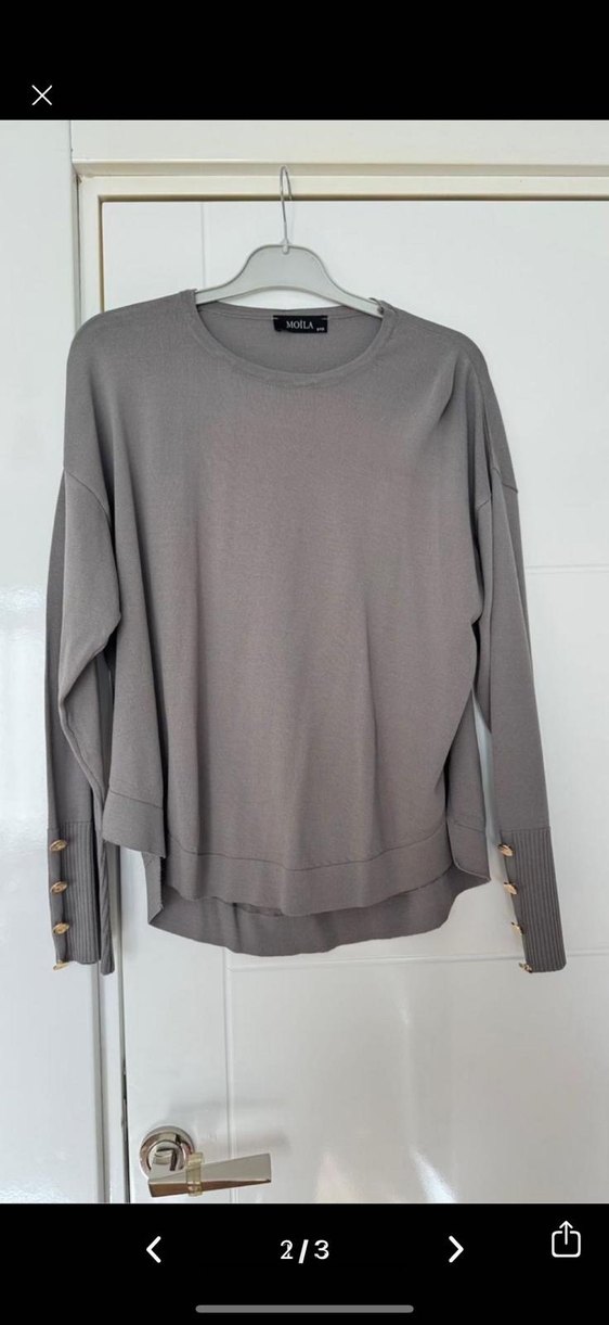 Gri renkte, düğmeli manşetlere sahip uzun kollu, yuvarlak yakalı, bol kesim, normal midi uzunlukta kadın kazak. Yumuşak sentetik kumaştan üretilmiştir.