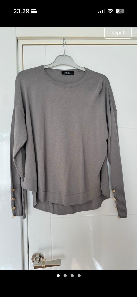 Gri renkte, düğmeli uzun kollu, yuvarlak yakalı ve bol kesim kadın kazak. Günlük kullanıma uygun, rahat ve sade tarzda, yumuşak sentetik kumaştan yapılmıştır.