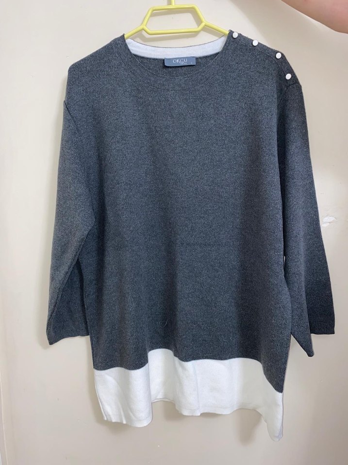 Mağazamızı kapatıyoruz. Elimizdeki son ürünleri satıyoruz. Yeni ve kullanılmamıştır.Gri renkli, yuvarlak yakalı, omuzunda düğme detayları bulunan örme kadın triko. Rahat kesim ve beyaz detaylı normal boyda, günlük kullanıma uygun.